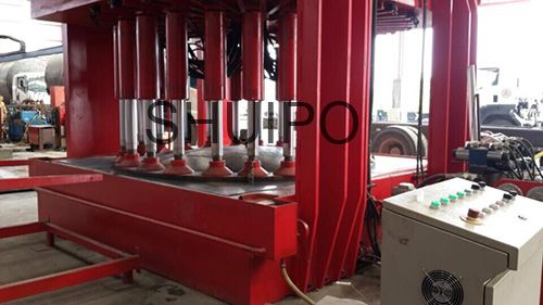 液壓缸采用倒吊的方式安裝在上平臺上,上平臺安裝導向條,液壓缸可在導向條內自由移動,以適應各種封頭的形狀。液壓系統應用比較廣泛,其壓力大、可操作性好,配件比較容易采購。