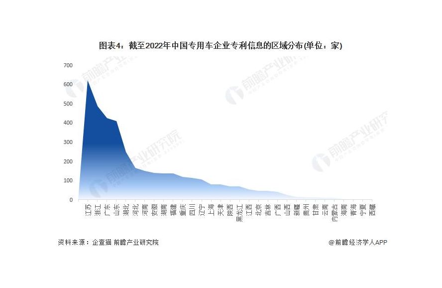 根據中國企業數據庫企查貓,目前中國專用車有相關專利信息的企業主要分布在江蘇和浙江等地。截至目前,江蘇省共有 621 家企業擁有專利相關信息,而浙江則有 487 家企業擁有專利相關信息。